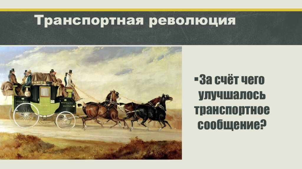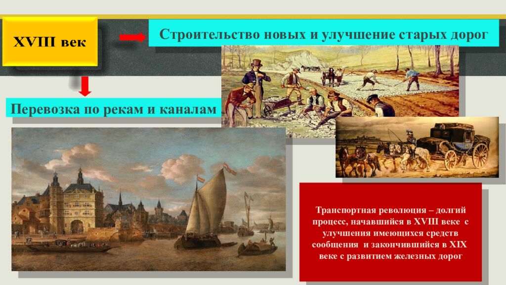 Строительство новых и улучшение старых дорог Перевозка по рекам и каналам Транспортная революция – долгий процесс, начавшийся в XVIII веке с улучшения имеющихся средств сообщения и закончившийся в XIX веке с развитием железных дорог