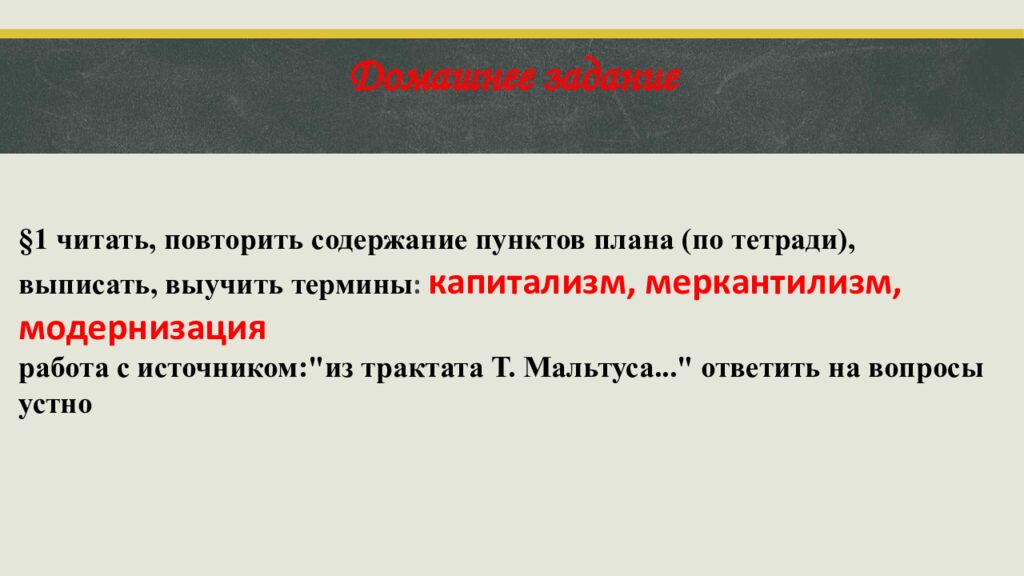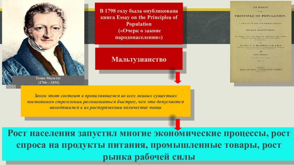 Томас Мальтус (1766—1834) В 1798 году была опубликована книга Essay on the Principleа of Population («Очерк о законе народонаселения») Мальтузианство Закон этот состоит в проявляющемся во всех живых существах постоянном стремлении размножаться быстрее, чем это допускается находящимся в их распоряжении количестве пищи Рост населения запустил многие экономические процессы, рост спроса на продукты питания, промышленные товары, рост рынка рабочей силы