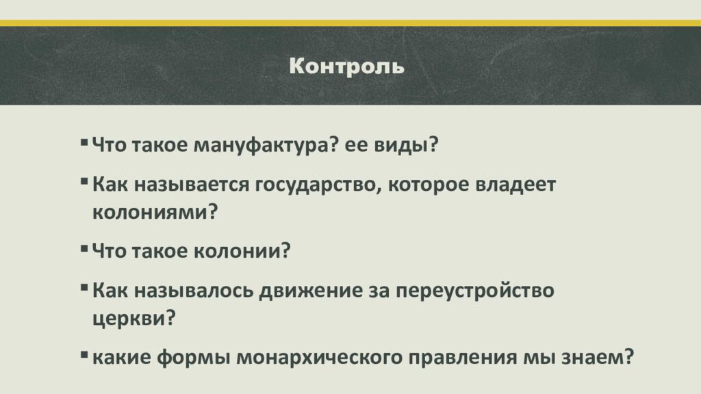 Что такое мануфактура? ее виды? Как называется государство, которое владеет колониями? Что такое колонии? Как называлось движение за переустройство церкви? какие формы монархического правления мы знаем?