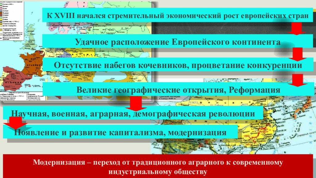 Научная, военная, аграрная, демографическая революции К XVIII начался стремительный экономический рост европейских стран Удачное расположение Европейского континента Отсутствие набегов кочевников, процветание конкуренции Великие географические открытия, Реформация Появление и развитие капитализма, модернизация Модернизация – переход от традиционного аграрного к современному индустриальному обществу