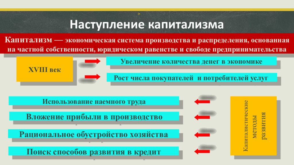 Капитализм — экономическая система производства и распределения, основанная на частной собственности, юридическом равенстве и свободе предпринимательства XVIII век Увеличение количества денег в экономике Рост числа покупателей и потребителей услуг Использование наемного труда Вложение прибыли в производство Рациональное обустройство хозяйства Поиск способов развития в кредит Капиталистические методы развития Наступление капитализма