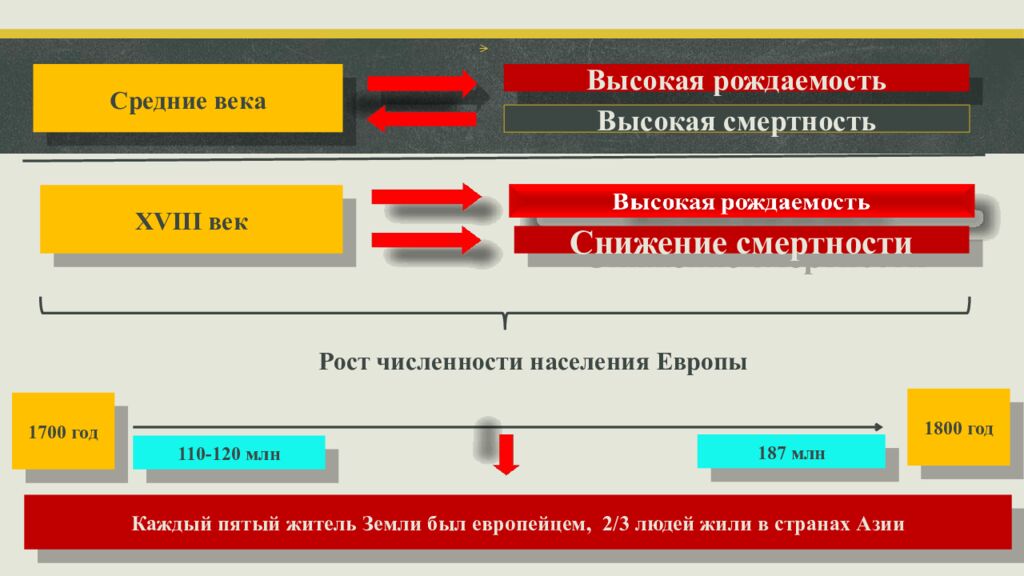 Средние века Высокая рождаемость Высокая смертность XVIII век Снижение смертности Рост численности населения Европы 1700 год 1800 год 110-120 млн 187 млн Каждый пятый житель Земли был европейцем, 2/3 людей жили в странах Азии