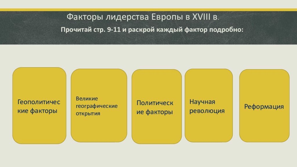 Факторы лидерства Европы в XVIII в. Прочитай стр. 9-11 и раскрой каждый фактор подробно: Геополитические факторы Великие географические открытия Политические факторы Научная революция Реформация
