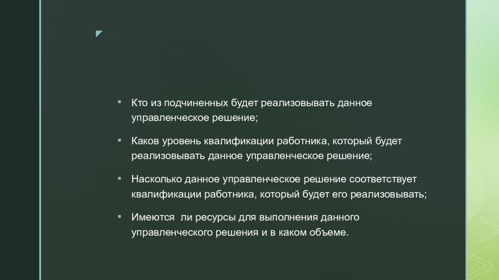 Кто из подчиненных будет реализовывать данное управленческое решение; Каков уровень квалификации работника, который будет реализовывать данное управленческое решение; Насколько данное управленческое решение соответствует квалификации работника, который будет его реализовывать; Имеются ли ресурсы для выполнения данного управленческого решения и в каком объеме.