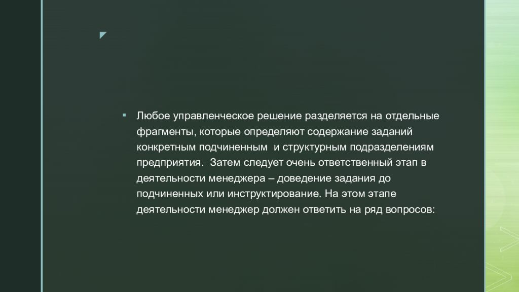 Любое управленческое решение разделяется на отдельные фрагменты, которые определяют содержание заданий конкретным подчиненным и структурным подразделениям предприятия. Затем следует очень ответственный этап в деятельности менеджера – доведение задания до подчиненных или инструктирование. На этом этапе деятельности менеджер должен ответить на ряд вопросов: