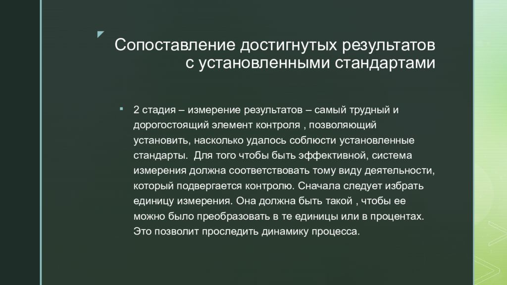 2 стадия – измерение результатов – самый трудный и дорогостоящий элемент контроля, позволяющий установить, насколько удалось соблюсти установленные стандарты. Для того чтобы быть эффективной, система измерения должна соответствовать тому виду деятельности, который подвергается контролю. Сначала следует избрать единицу измерения. Она должна быть такой, чтобы ее можно было преобразовать в те единицы или в процентах. Это позволит проследить динамику процесса.