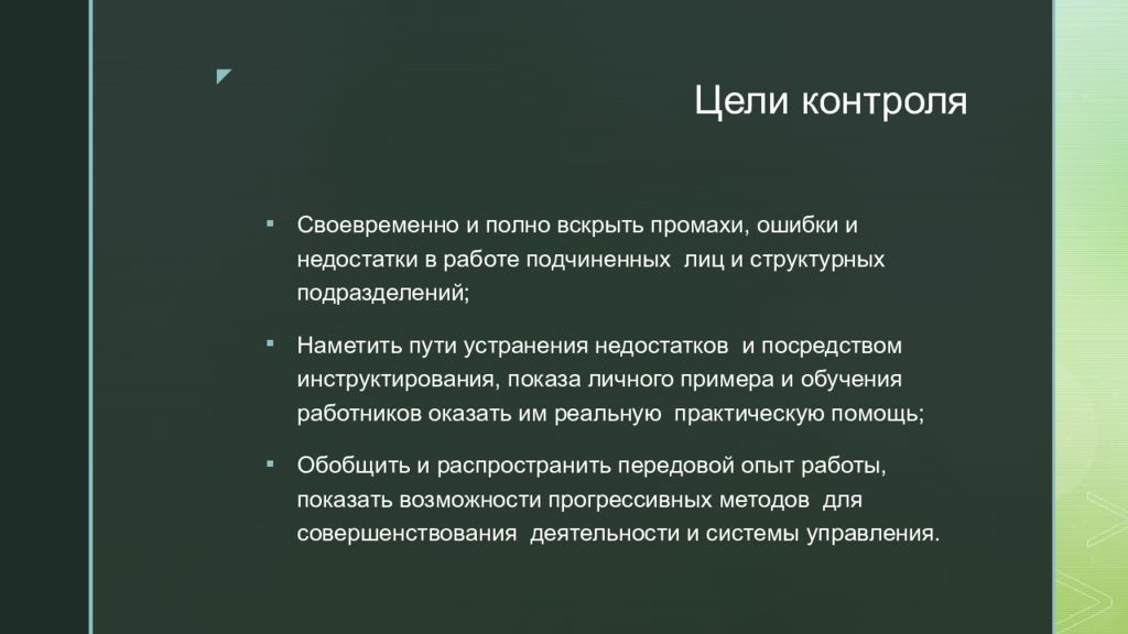 Своевременно и полно вскрыть промахи, ошибки и недостатки в работе подчиненных лиц и структурных подразделений; Наметить пути устранения недостатков и посредством инструктирования, показа личного примера и обучения работников оказать им реальную практическую помощь; Обобщить и распространить передовой опыт работы, показать возможности прогрессивных методов для совершенствования деятельности и системы управления.
