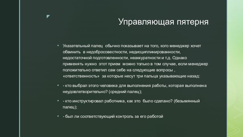 Указательный палец обычно показывает на того, кого менеджер хочет обвинить в недобросовестности, недисциплинированности, недостаточной подготовленности, неаккуратности и т.д. Однако применять нужно этот прием можно только в том случае, если менеджер положительно ответил сам себе на следующие вопросы, «ответственность» за которые несут три пальца указывающие назад: - кто выбрал этого человека для выполнения работы, которая выполнена неудовлетворительно? (средний палец); - кто инструктировал работника, как это было сделано? (безымянный палец); - был ли соответствующий контроль за его работой