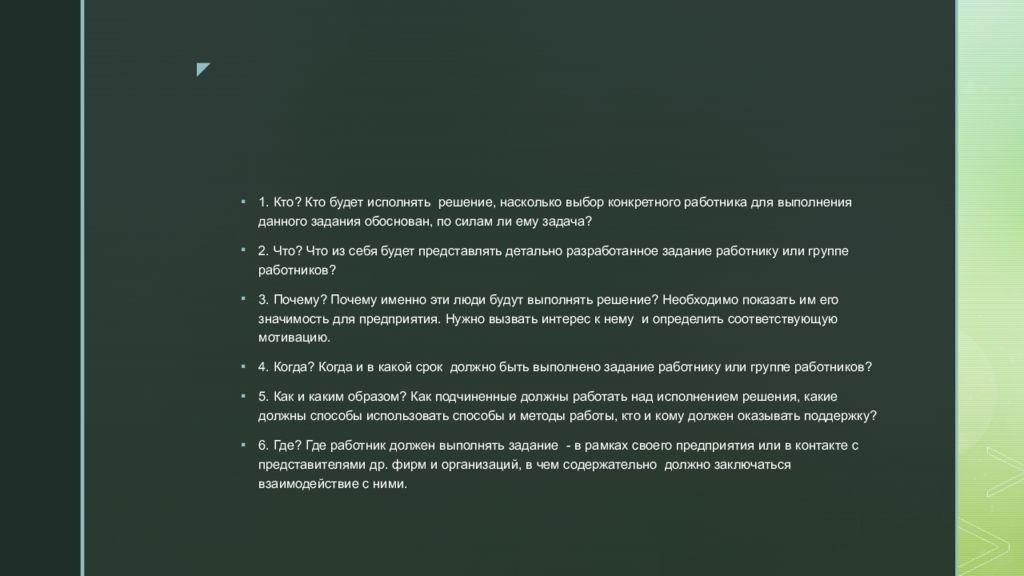 1. Кто? Кто будет исполнять решение, насколько выбор конкретного работника для выполнения данного задания обоснован, по силам ли ему задача? 2. Что? Что из себя будет представлять детально разработанное задание работнику или группе работников? 3. Почему? Почему именно эти люди будут выполнять решение? Необходимо показать им его значимость для предприятия. Нужно вызвать интерес к нему и определить соответствующую мотивацию. 4. Когда? Когда и в какой срок должно быть выполнено задание работнику или группе работников? 5. Как и каким образом? Как подчиненные должны работать над исполнением решения, какие должны способы использовать способы и методы работы, кто и кому должен оказывать поддержку? 6. Где? Где работник должен выполнять задание - в рамках своего предприятия или в контакте с представителями др. фирм и организаций, в чем содержательно должно заключаться взаимодействие с ними.