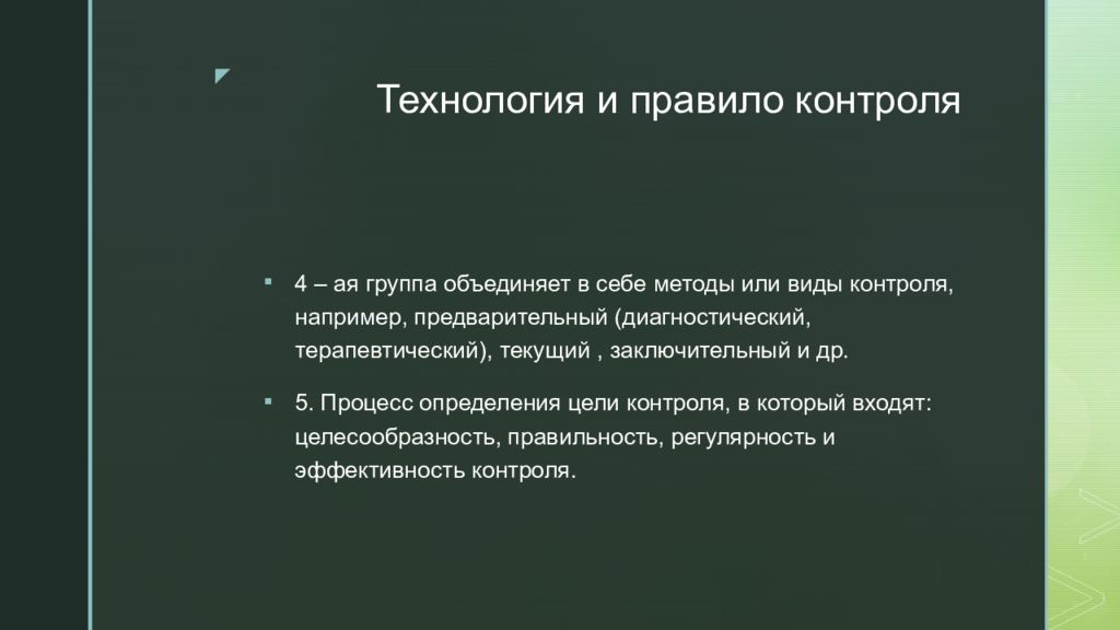 4 – ая группа объединяет в себе методы или виды контроля, например, предварительный (диагностический, терапевтический), текущий, заключительный и др. 5. Процесс определения цели контроля, в который входят: целесообразность, правильность, регулярность и эффективность контроля.