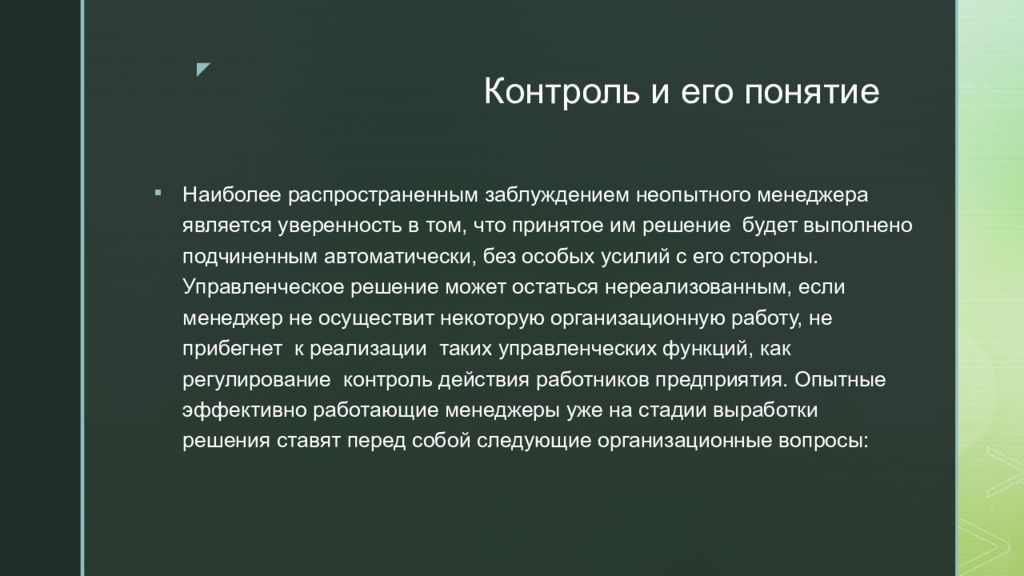 Наиболее распространенным заблуждением неопытного менеджера является уверенность в том, что принятое им решение будет выполнено подчиненным автоматически, без особых усилий с его стороны. Управленческое решение может остаться нереализованным, если менеджер не осуществит некоторую организационную работу, не прибегнет к реализации таких управленческих функций, как регулирование контроль действия работников предприятия. Опытные эффективно работающие менеджеры уже на стадии выработки решения ставят перед собой следующие организационные вопросы: