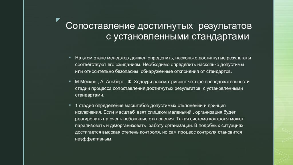На этом этапе менеджер должен определить, насколько достигнутые результаты соответствуют его ожиданиям. Необходимо определить насколько допустимы или относительно безопасны обнаруженные отклонения от стандартов. М.Мескон, А. Альберт, Ф. Хедоури рассматривают четыре последовательности стадии процесса сопоставления достигнутых результатов с установленными стандартами. 1 стадия определение масштабов допустимых отклонений и принцип исключения. Если масштаб взят слишком маленький, организация будет реагировать на очень небольшие отклонения. Такая система контроля может парализовать и дезорганизовать работу организации. В подобных ситуациях достигается высокая степень контроля, но сам процесс контроля становится неэффективным.