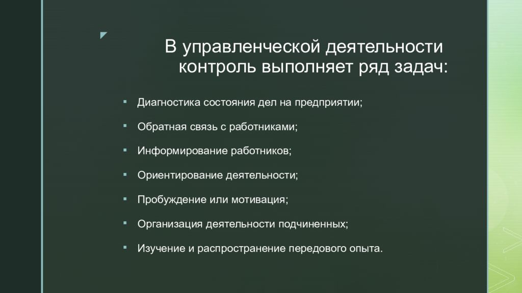 Слайд 9: В управленческой деятельности контроль выполняет ряд задач: