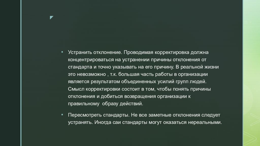 Устранить отклонение. Проводимая корректировка должна концентрироваться на устранении причины отклонения от стандарта и точно указывать на его причину. В реальной жизни это невозможно, т.к. большая часть работы в организации является результатом объединенных усилий групп людей. Смысл корректировки состоит в том, чтобы понять причины отклонения и добиться возвращения организации к правильному образу действий. Пересмотреть стандарты. Не все заметные отклонения следует устранять. Иногда саи стандарты могут оказаться нереальными.