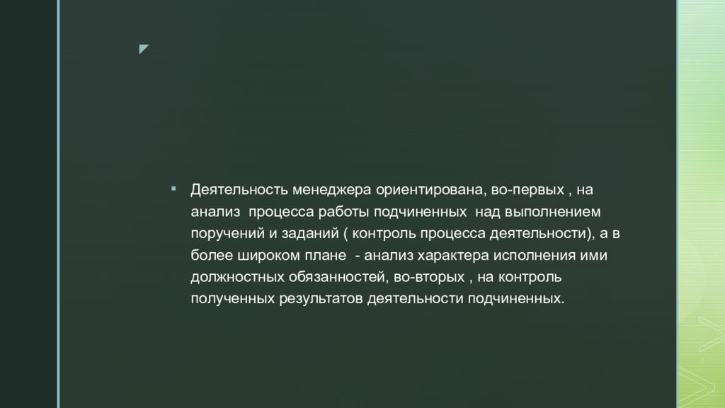 Деятельность менеджера ориентирована, во-первых, на анализ процесса работы подчиненных над выполнением поручений и заданий ( контроль процесса деятельности), а в более широком плане - анализ характера исполнения ими должностных обязанностей, во-вторых, на контроль полученных результатов деятельности подчиненных.