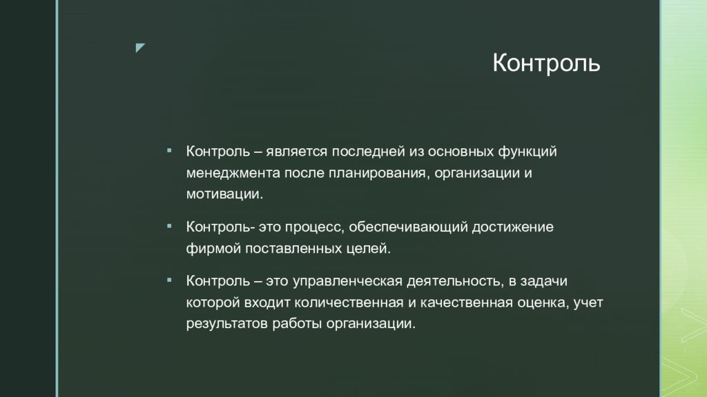 Контроль – является последней из основных функций менеджмента после планирования, организации и мотивации. Контроль- это процесс, обеспечивающий достижение фирмой поставленных целей. Контроль – это управленческая деятельность, в задачи которой входит количественная и качественная оценка, учет результатов работы организации.