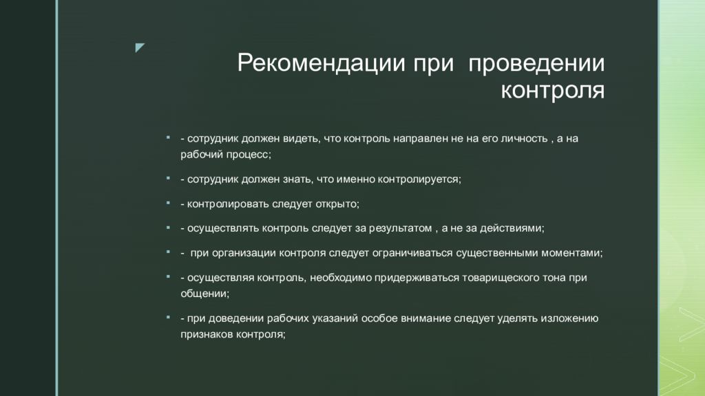 - сотрудник должен видеть, что контроль направлен не на его личность, а на рабочий процесс; - сотрудник должен знать, что именно контролируется; - контролировать следует открыто; - осуществлять контроль следует за результатом, а не за действиями; - при организации контроля следует ограничиваться существенными моментами; - осуществляя контроль, необходимо придерживаться товарищеского тона при общении; - при доведении рабочих указаний особое внимание следует уделять изложению признаков контроля;