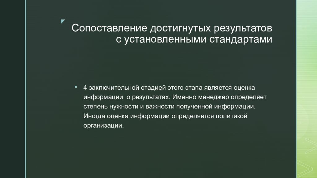 4 заключительной стадией этого этапа является оценка информации о результатах. Именно менеджер определяет степень нужности и важности полученной информации. Иногда оценка информации определяется политикой организации.