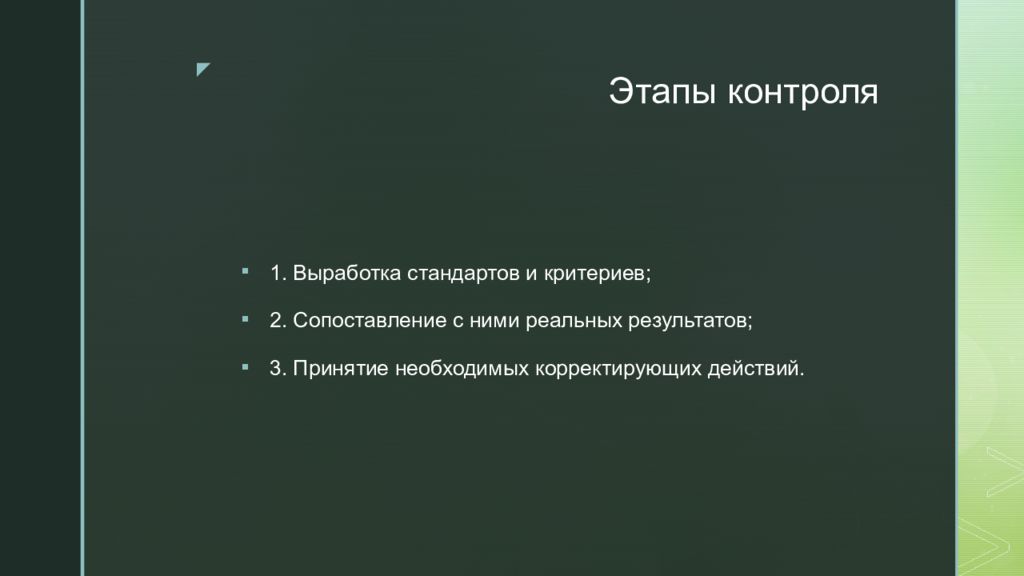 1. Выработка стандартов и критериев; 2. Сопоставление с ними реальных результатов; 3. Принятие необходимых корректирующих действий.