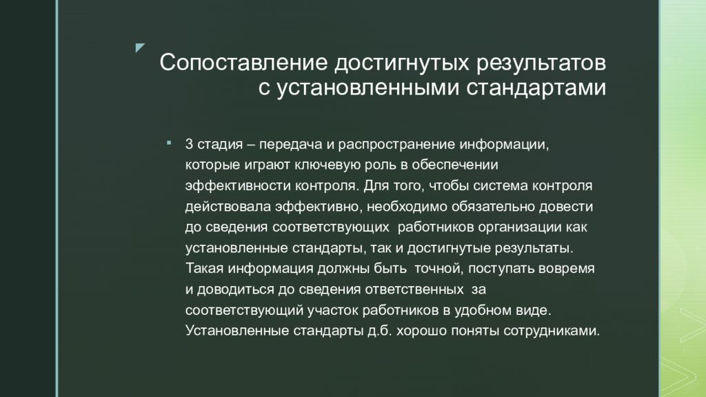 3 стадия – передача и распространение информации, которые играют ключевую роль в обеспечении эффективности контроля. Для того, чтобы система контроля действовала эффективно, необходимо обязательно довести до сведения соответствующих работников организации как установленные стандарты, так и достигнутые результаты. Такая информация должны быть точной, поступать вовремя и доводиться до сведения ответственных за соответствующий участок работников в удобном виде. Установленные стандарты д.б. хорошо поняты сотрудниками.
