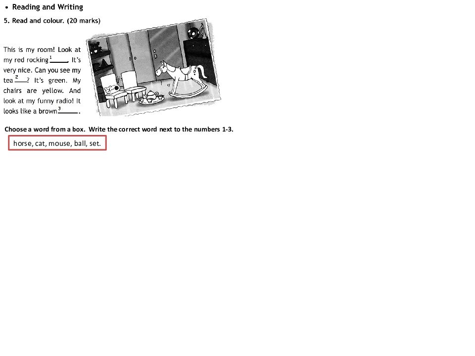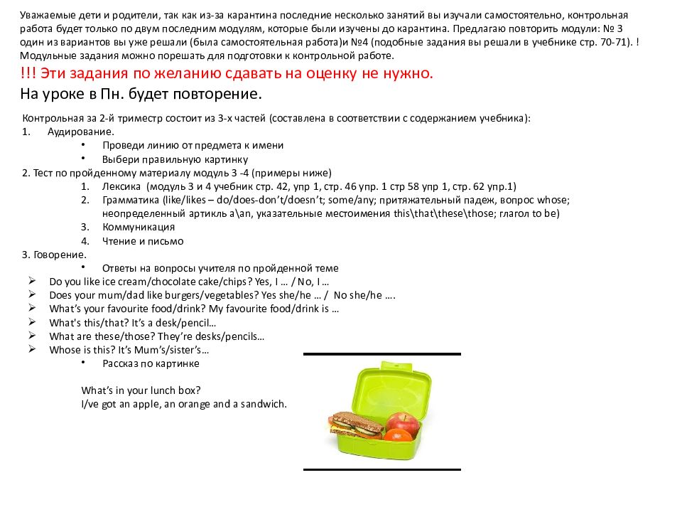 Контрольная за 2-й триместр состоит из 3-х частей (составлена в соответствии с содержанием учебника): Аудирование. Проведи линию от предмета к имени Выбери правильную картинку 2. Тест по пройденному материалу модуль 3 -4 (примеры ниже) Лексика (модуль 3 и 4 учебник стр. 42, упр 1, стр. 46 упр. 1 стр 58 упр 1, стр. 62 упр.1) Грамматика ( like/likes – do/does-don’t/doesn’t ; some/any ; притяжательный падеж, вопрос whose ; неопределенный артикль a\an, указательные местоимения this\that\these\those ; глагол to be) Коммуникация Чтение и письмо 3. Говорение. Ответы на вопросы учителя по пройденной теме Do you like ice cream/chocolate cake/chips? Yes, I … / No, I … Does your mum/dad like burgers/vegetables? Yes she/he … / No she/he …. What’s your favourite food/drink? My favourite food/drink is … What's this/that? It’s a desk/pencil… What are these/those? They’re desks/pencils… Whose is this ? It’s Mum’s/sister’s… Рассказ по картинке What’s in your lunch box? I/ ve got an apple, an orange and a sandwich. Уважаемые дети и родители, так как из-за карантина последние несколько занятий вы изучали самостоятельно, контрольная работа будет только по двум последним модулям, которые были изучены до карантина. Предлагаю повторить модули: № 3 один из вариантов вы уже решали (была самостоятельная работа)и №4 (подобные задания вы решали в учебнике стр. 70-71). ! Модульные задания можно порешать для подготовки к контрольной работе. !!! Эти задания по желанию сдавать на оценку не нужно. На уроке в Пн. будет повторение.