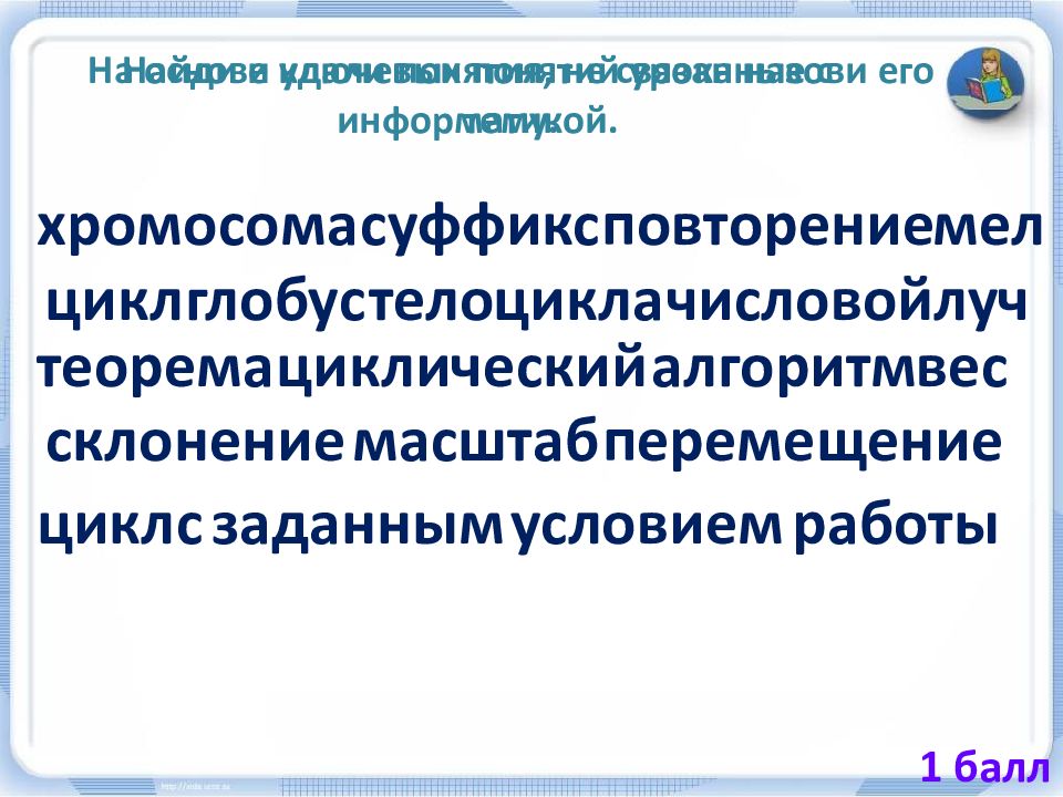 На основе ключевых понятий урока назови его тему. 1 балл хромосома суффикс цикл повторение глобус работы тело теорема числовойлуч вес циклический мел цикла алгоритм условием цикл с заданным склонение масштаб перемещение