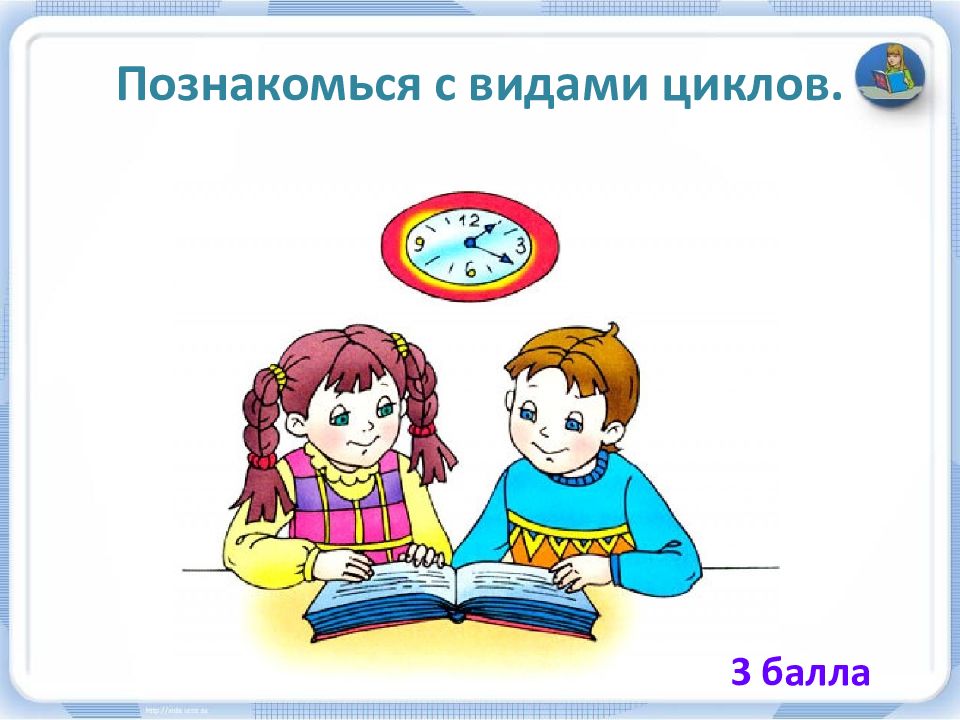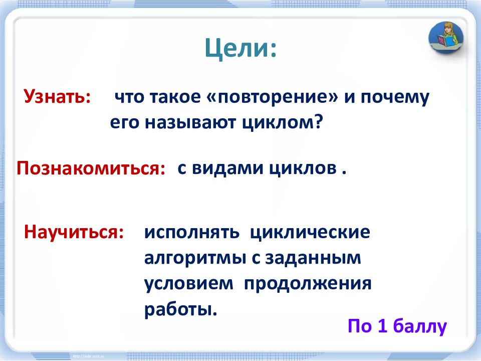 Познакомиться: с видами циклов. Узнать: что такое «повторение» и почему его называют циклом? По 1 баллу Цели: Научиться: исполнять циклические алгоритмы с заданным условием продолжения работы.