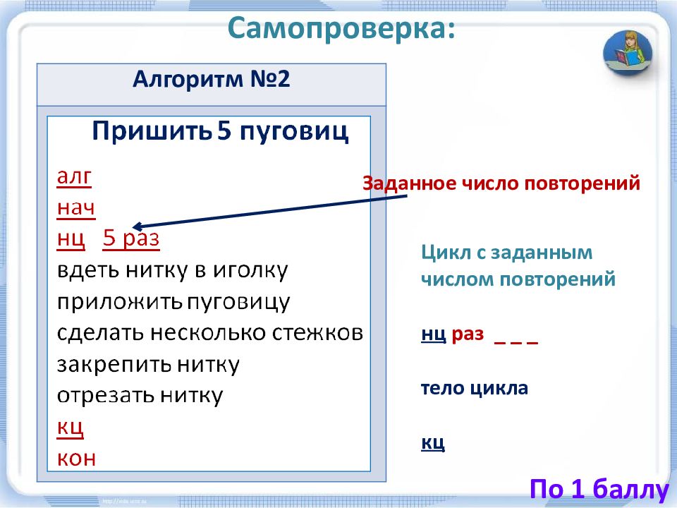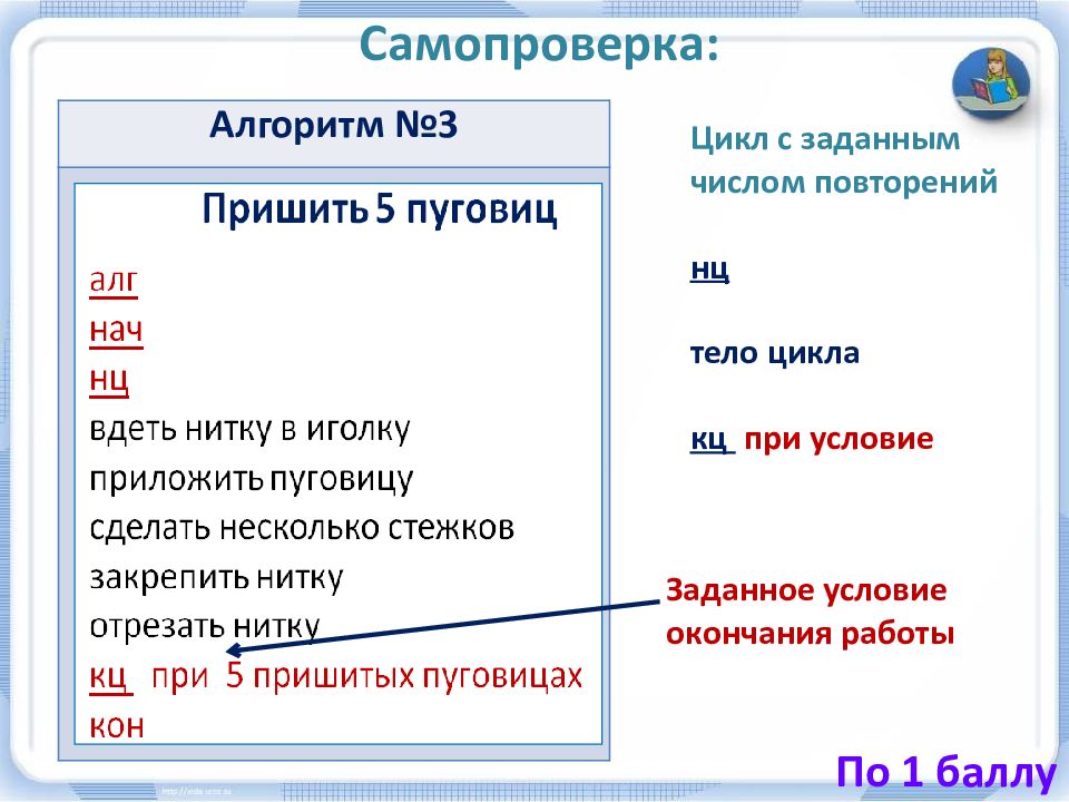 Алгоритм №3 Цикл с заданным числом повторений нц тело цикла кц при условие Заданное условие окончания работы По 1 баллу