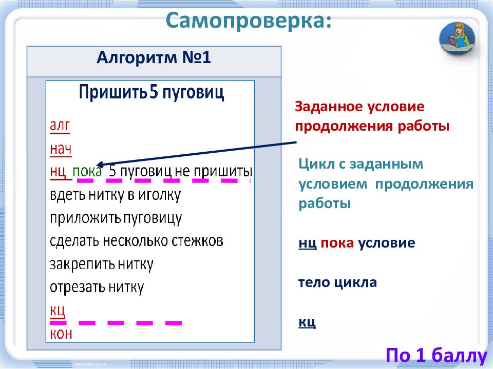 Алгоритм №1 Заданное условие продолжения работы Цикл с заданным условием продолжения работы нц пока условие тело цикла кц По 1 баллу