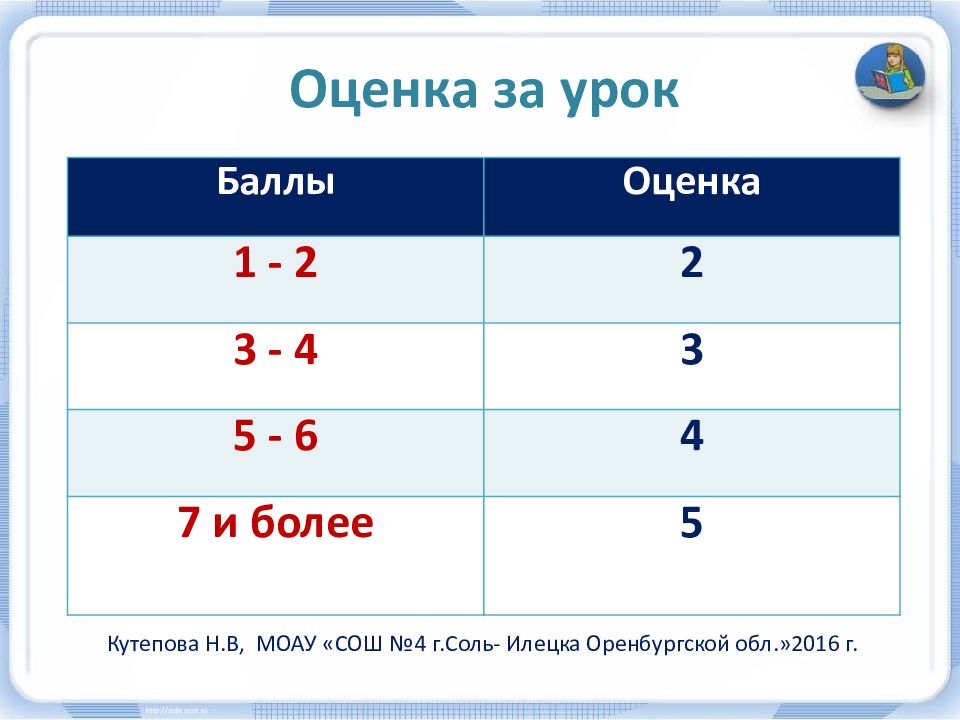 Баллы Оценка 1 - 2 2 3 - 4 3 5 - 6 4 7 и более 5 Кутепова Н.В, МОАУ «СОШ №4 г.Соль- Илецка Оренбургской обл.»2016 г.