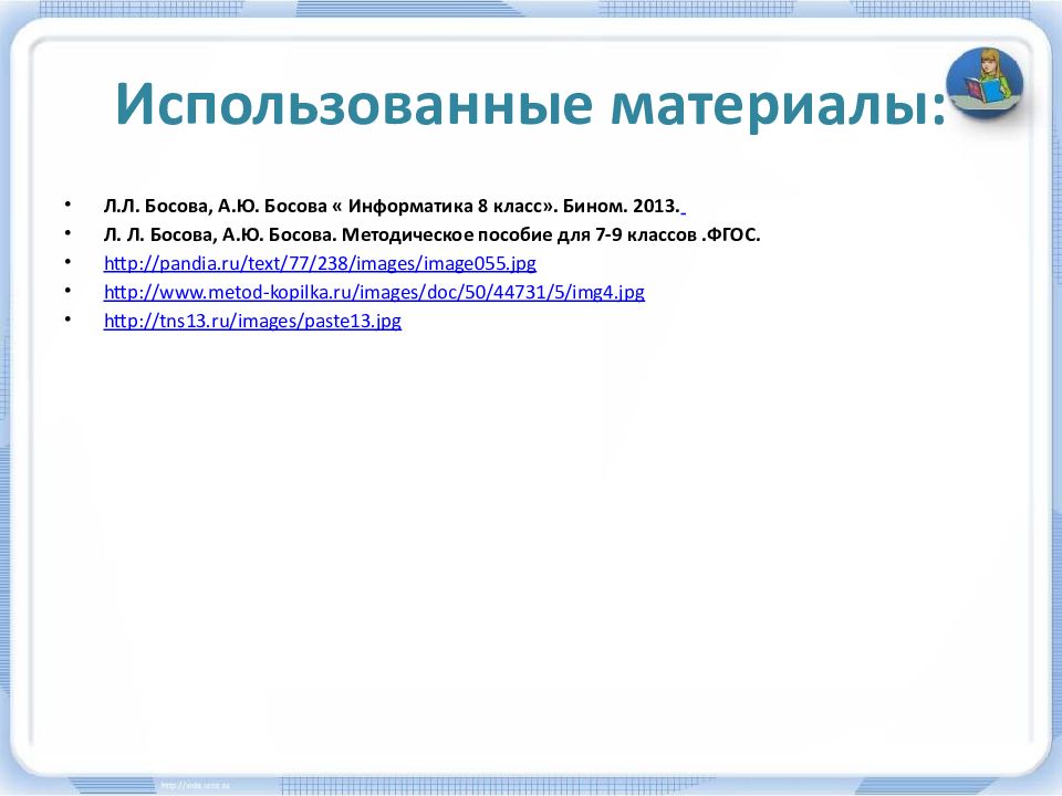 Л.Л. Босова, А.Ю. Босова « Информатика 8 класс». Бином. 2013. Л. Л. Босова, А.Ю. Босова. Методическое пособие для 7-9 классов.ФГОС. http://pandia.ru/text/77/238/images/image055.jpg http://www.metod-kopilka.ru/images/doc/50/44731/5/img4.jpg http://tns13.ru/images/paste13.jpg