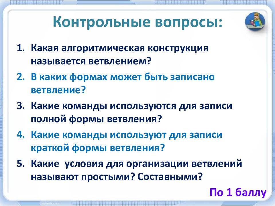Какая алгоритмическая конструкция называется ветвлением? В каких формах может быть записано ветвление? Какие команды используются для записи полной формы ветвления? Какие команды используют для записи краткой формы ветвления? Какие условия для организации ветвлений называют простыми? Составными? По 1 баллу
