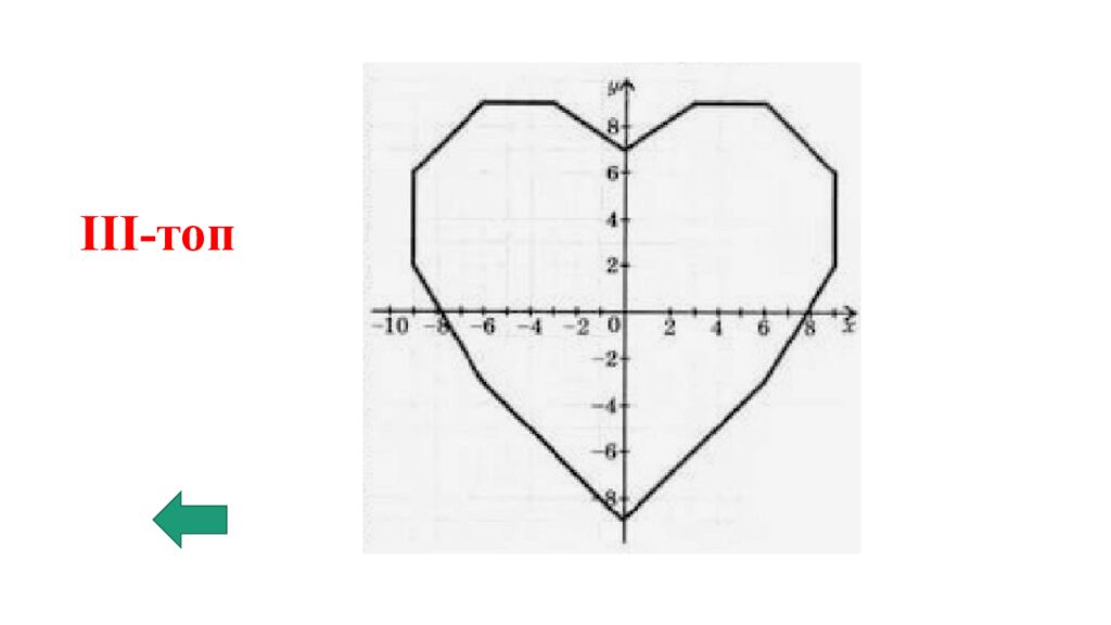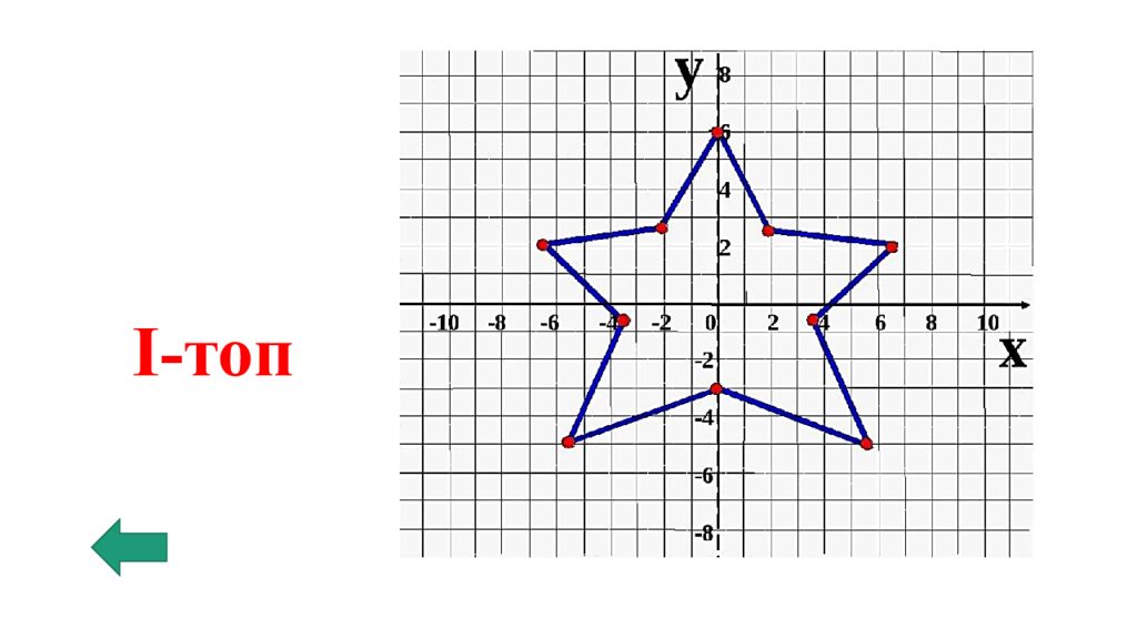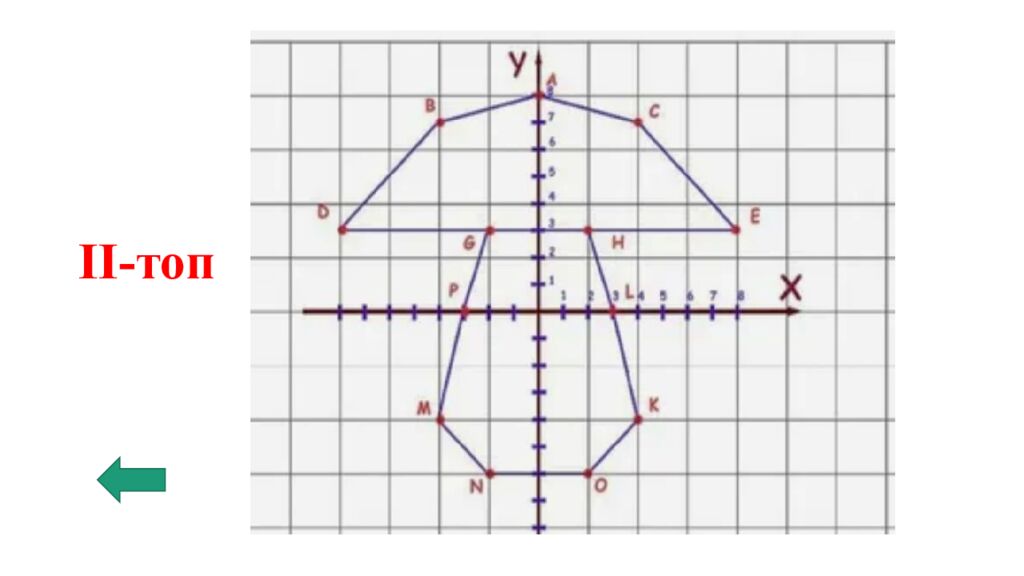 Дескриптор: 1) Тікбұрышты координаталар жүйесінде нүктелерді кескіндейді; 2) Нүктелерді тізбектеп қосып, сызбаларды сызады Жалпы 3 ұпай Берілген нүктелерді координаталық жүйеге салып, жасырылған суретті табыңыз. I- топ: A(-7;2) B(-2;3) C(0;6) D(2;3) E(7;2) F(4;-1) G(5;-5) H(0;-3) I(-5;-5) J(-4;-1) II- топ: A( -2;3 ) B(-8;3) C(-4;7) D(0;8) E(4;7) F(8;3) G(2;3) H(3;0) I(4;-4) J(2;-6) K(-2;-6) L(-4;-4) M(-3;0) III- топ: A( 0;7 ) B(-3;9) C(-6;9) D(-9;6) E(-9;2) F(-6;-3) G(0;-9) H(6;-3) I(9;2) J(9;6) K(6;9) L(3;9)