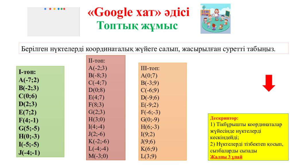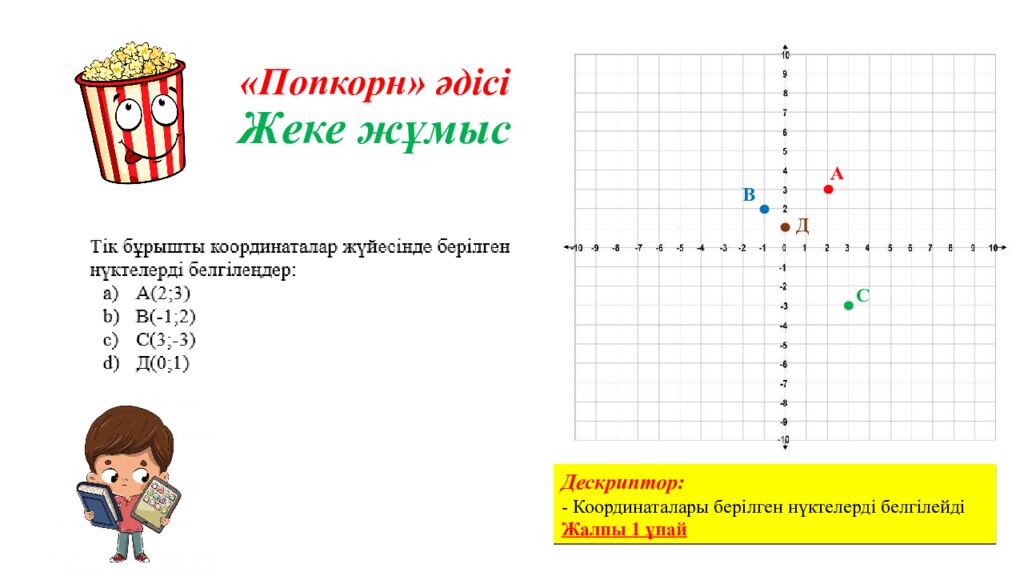 Дескриптор: - Координаталары берілген нүктелерді белгілейді Жалпы 1 ұпай A B C Д