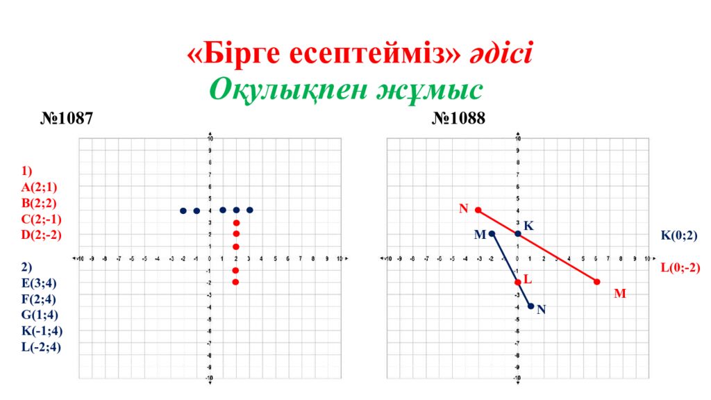«Бірге есептейміз» әдісі Оқулықпен жұмыс № 1087 № 1088 1) А(2;1) В(2;2) С(2;-1) D (2;-2) 2) Е(3;4) F(2;4) G(1;4) K(-1;4) L(-2;4) M N K M N L K(0;2) L(0;-2)