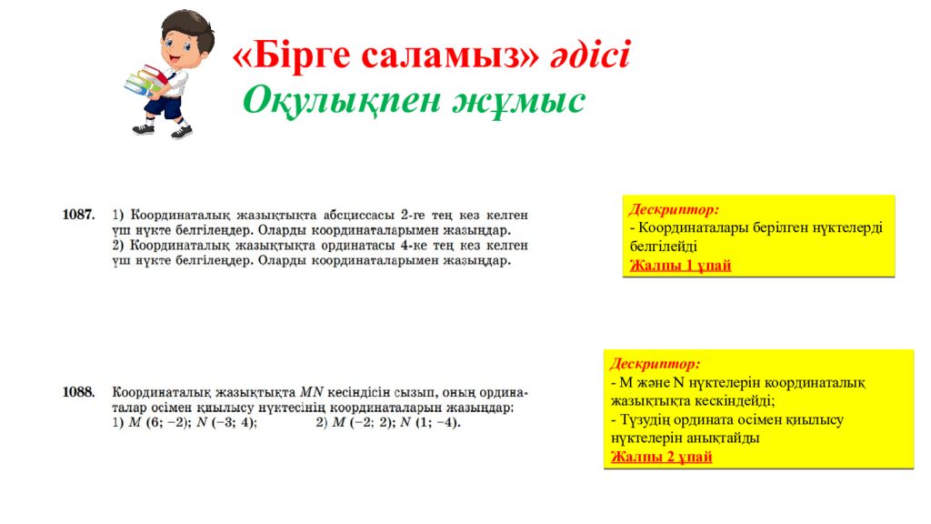 Дескриптор: - Координаталары берілген нүктелерді белгілейді Жалпы 1 ұпай Дескриптор: - M және N нүктелерін координаталық жазықтықта кескіндейді; - Түзудің ордината осімен қиылысу нүктелерін анықтайды Жалпы 2 ұпай