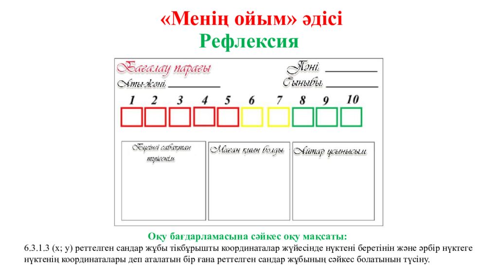 Последний слайд презентации: Координаталық жазықтық. Тікбұрышты координаталар жүйесі: Менің ойым» әдісі Рефлексия