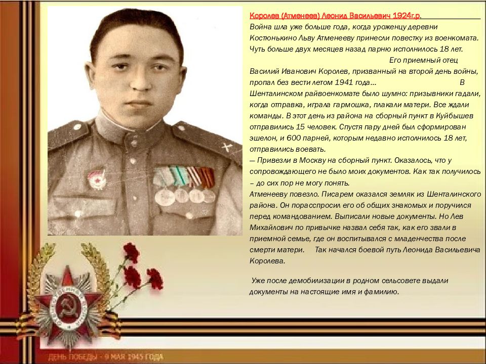 Королев ( Атменеев ) Леонид Васильевич 1924г.р. Война шла уже больше года, когда уроженцу деревни Костюнькино Льву Атменееву принесли повестку из военкомата. Чуть больше двух месяцев назад парню исполнилось 18 лет. Его приемный отец Василий Иванович Королев, призванный на второй день войны, пропал без вести летом 1941 года… В Шенталинском райвоенкомате было шумно: призывники гадали, когда отправка, играла гармошка, плакали матери. Все ждали команды. В этот день из района на сборный пункт в Куйбышев отправились 15 человек. Спустя пару дней был сформирован эшелон, и 600 парней, которым недавно исполнилось 18 лет, отправились воевать. — Привезли в Москву на сборный пункт. Оказалось, что у сопровождающего не было моих документов. Как так получилось – до сих пор не могу понять. Атменееву повезло. Писарем оказался земляк из Шенталинского района. Он порасспросил его об общих знакомых и поручился перед командованием. Выписали новые документы. Но Лев Михайлович по привычке назвал себя так, как его звали в приемной семье, где он воспитывался с младенчества после смерти матери. Так начался боевой путь Леонида Васильевича Королева. Уже после демобилизации в родном сельсовете выдали документы на настоящие имя и фамилию.