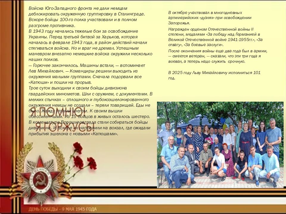 Войска Юго-Западного фронта не дали немцам деблокировать окруженную группировку в Сталинграде. Вскоре бойцы 100-го полка участвовали и в полном разгроме противника. В 1943 году начались тяжелые бои за освобождение Украины. Перед третьей битвой за Харьков, которая началась в феврале 1943 года, в район действий начали стягиваться войска. Но и враг не дремал. Успешным маневром внезапно немецкие войска окружили несколько наших полков. — Горючее закончилось. Машины встали, — вспоминает Лев Михайлович. — Командиры решили выходить из окружения малыми группами. Сначала подорвали все «Катюши» и пошли на прорыв. Трое суток выходили к своим бойцы дивизиона гвардейских минометов. Шли с оружием, с документами. В мелких стычках – сплошного и глубокоэшелонированного окружения немцы не создали – теряли товарищей. Еды не было. Жажду утоляли снегом. К своим вышли обессиленными. Из 15 бойцов в живых осталось шестеро. В комендатуре Ворошиловграда стали собираться бойцы дивизиона. И вскоре их направили на вокзал, где ожидали прибытия эшелона с новыми «Катюшами». В октябре участвовал в многодневных артиллерийских «дуэлях» при освобождении Запорожья. Награжден орденом Отечественной войны II степени, медалями «За победу над Германией в Великой Отечественной войне 1941-1955гг.», «За отвагу», «За боевые заслуги ». После окончания войны еще два года был в армии, — смеется ветеран, — сказали, что эти три года я воевал, а теперь надо служить срочную. В 2025 году Льву Михайловичу исполниться 101 год.