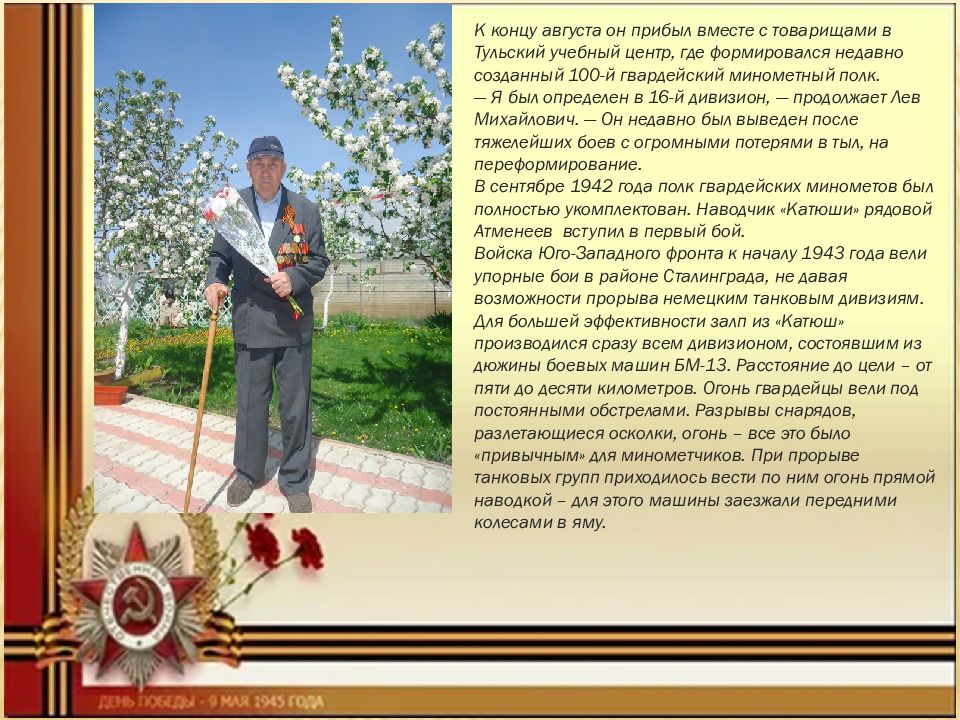 К концу августа он прибыл вместе с товарищами в Тульский учебный центр, где формировался недавно созданный 100-й гвардейский минометный полк. — Я был определен в 16-й дивизион, — продолжает Лев Михайлович. — Он недавно был выведен после тяжелейших боев с огромными потерями в тыл, на переформирование. В сентябре 1942 года полк гвардейских минометов был полностью укомплектован. Наводчик «Катюши» рядовой Атменеев вступил в первый бой. Войска Юго-Западного фронта к началу 1943 года вели упорные бои в районе Сталинграда, не давая возможности прорыва немецким танковым дивизиям. Для большей эффективности залп из «Катюш» производился сразу всем дивизионом, состоявшим из дюжины боевых машин БМ-13. Расстояние до цели – от пяти до десяти километров. Огонь гвардейцы вели под постоянными обстрелами. Разрывы снарядов, разлетающиеся осколки, огонь – все это было «привычным» для минометчиков. При прорыве танковых групп приходилось вести по ним огонь прямой наводкой – для этого машины заезжали передними колесами в яму.