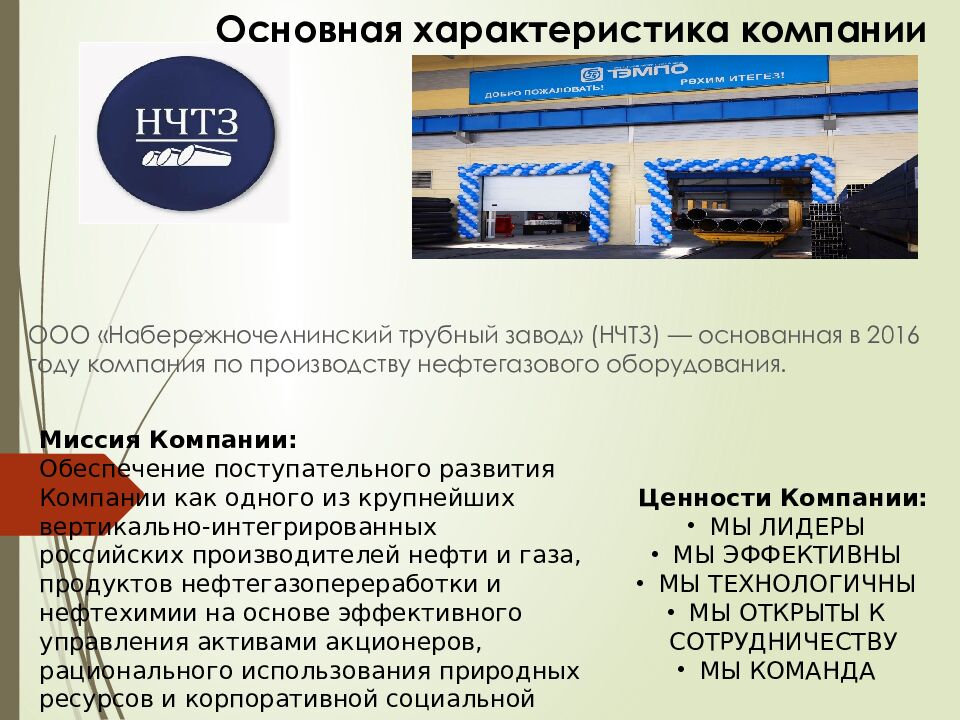ООО « Набережночелнинский трубный завод» (НЧТЗ) — основанная в 2016 году компания по производству нефтегазового оборудования. Миссия Компании: Обеспечение поступательного развития Компании как одного из крупнейших вертикально-интегрированных российских производителей нефти и газа, продуктов нефтегазопереработки и нефтехимии на основе эффективного управления активами акционеров, рационального использования природных ресурсов и корпоративной социальной ответственности. Ценности Компании: МЫ ЛИДЕРЫ МЫ ЭФФЕКТИВНЫ МЫ ТЕХНОЛОГИЧНЫ МЫ ОТКРЫТЫ К СОТРУДНИЧЕСТВУ МЫ КОМАНДА Основная характеристика компании