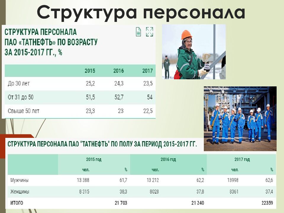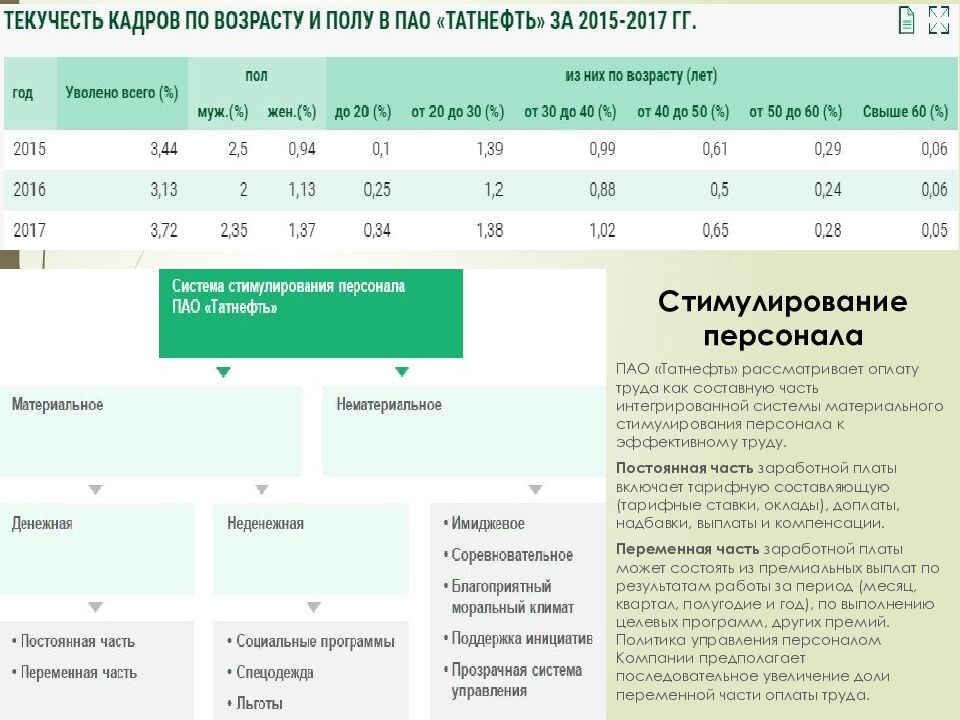 Стимулирование персонала ПАО «Татнефть» рассматривает оплату труда как составную часть интегрированной системы материального стимулирования персонала к эффективному труду. Постоянная часть заработной платы включает тарифную составляющую (тарифные ставки, оклады), доплаты, надбавки, выплаты и компенсации. Переменная часть заработной платы может состоять из премиальных выплат по результатам работы за период (месяц, квартал, полугодие и год), по выполнению целевых программ, других премий. Политика управления персоналом Компании предполагает последовательное увеличение доли переменной части оплаты труда.