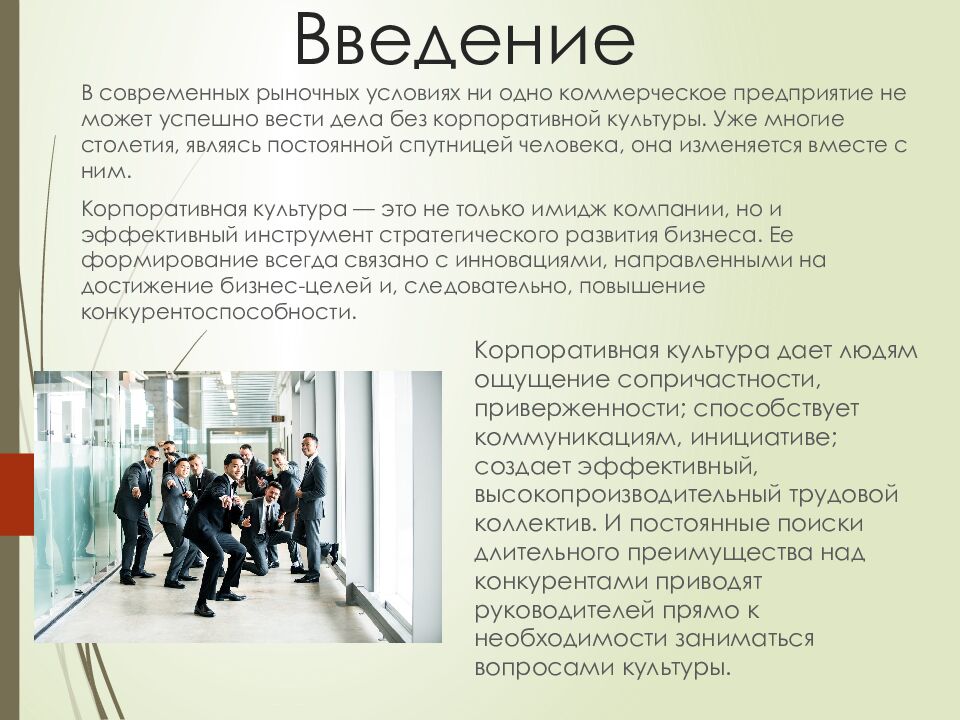 В современных рыночных условиях ни одно коммерческое предприятие не может успешно вести дела без корпоративной культуры. Уже многие столетия, являясь постоянной спутницей человека, она изменяется вместе с ним. Корпоративная культура — это не только имидж компании, но и эффективный инструмент стратегического развития бизнеса. Ее формирование всегда связано с инновациями, направленными на достижение бизнес-целей и, следовательно, повышение конкурентоспособности. Корпоративная культура дает людям ощущение сопричастности, приверженности; способствует коммуникациям, инициативе; создает эффективный, высокопроизводительный трудовой коллектив. И постоянные поиски длительного преимущества над конкурентами приводят руководителей прямо к необходимости заниматься вопросами культуры.