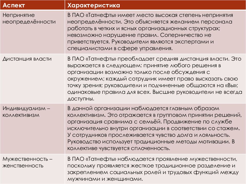 Аспект Характеристика Непринятие неопределённости В ПАО « Татнефть » имеет место высокая степень непринятия неопределённости. Это объясняется желанием персонала работать в четких и ясных организационных структурах; невозможно нарушение правил. Соперничество не приветствуется. Руководители являются экспертами и специалистами в сфере управления. Дистанция власти В ПАО « Татнефть » преобладает средняя дистанция власти. Это выражается в следующем: принятие любого решения в организации возможно только после обсуждения с окружением; каждый сотрудник имеет право высказать свою точку зрения; руководители и подчиненные общаются на «Вы»; одинаковые правила для всех. Высшие руководители не всегда доступны. Индивидуализм – коллективизм В данной организации наблюдается главным образом коллективизм. Это отражается в групповом принятии решений, организация сравнима с семьёй. Продвижение по службе исключительно внутри организации в соответствии со стажем. У сотрудников прослеживается чувство долга и лояльность. Руководство использует традиционные методы мотивации. В коллективе чувствуется сплоченность. Мужественность – женственность В ПАО « Татнефть » наблюдается проявление мужественности, поскольку проявляется жесткое традиционное разделение и закреплением социальных ролей и трудовых функций между мужчинами и женщинами.