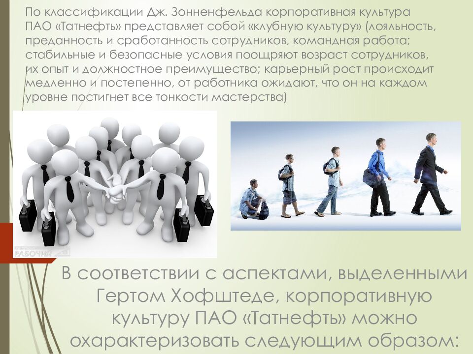 В соответствии с аспектами, выделенными Гертом Хофштеде, корпоративную культуру ПАО « Татнефть » можно охарактеризовать следующим образом: По классификации Дж. Зонненфельда корпоративная культура ПАО « Татнефть » представляет собой «клубную культуру» (лояльность, преданность и сработанность сотрудников, командная работа; стабильные и безопасные условия поощряют возраст сотрудников, их опыт и должностное преимущество; карьерный рост происходит медленно и постепенно, от работника ожидают, что он на каждом уровне постигнет все тонкости мастерства)