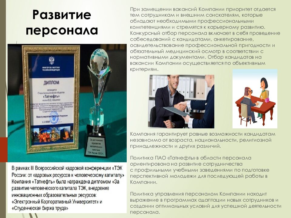 При замещении вакансий Компании приоритет отдается тем сотрудникам и внешним соискателям, которые обладают необходимыми профессиональными компетенциями и стремятся к карьерному развитию. Конкурсный отбор персонала включает в себя проведение собеседований с кандидатами, анкетирование, освидетельствование профессиональной пригодности и обязательный медицинский осмотр в соответствии с нормативными документами. Отбор кандидатов на вакансии Компании осуществляется по объективным критериям. Компания гарантирует равные возможности кандидатам независимо от возраста, национальности, религиозной принадлежности и других различий. Политика ПАО «Татнефть» в области персонала ориентирована на развитие сотрудничества с профильными учебными заведениями по подготовке перспективной молодежи для последующей работы в Компании. Политика управления персоналом Компании находит выражение в программах адаптации новых сотрудников и создании оптимальных условий для успешной деятельности персонала. Развитие персонала