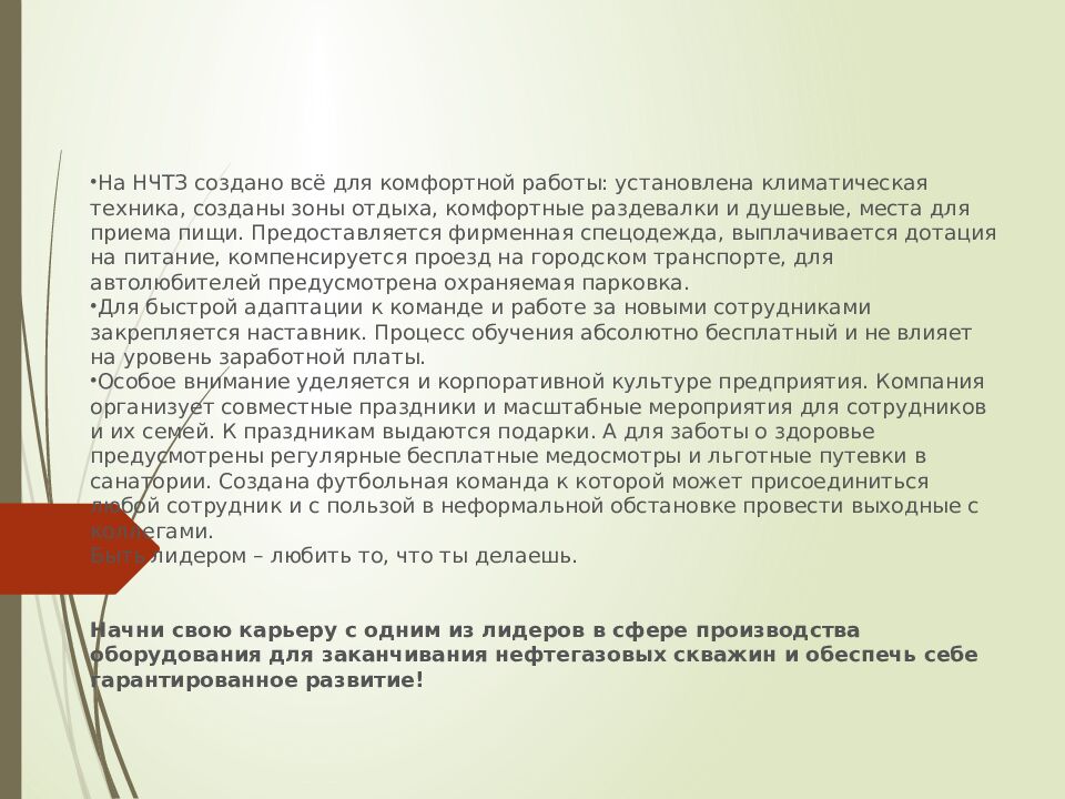 На НЧТЗ создано всё для комфортной работы: установлена климатическая техника, созданы зоны отдыха, комфортные раздевалки и душевые, места для приема пищи. Предоставляется фирменная спецодежда, выплачивается дотация на питание, компенсируется проезд на городском транспорте, для автолюбителей предусмотрена охраняемая парковка. Для быстрой адаптации к команде и работе за новыми сотрудниками закрепляется наставник. Процесс обучения абсолютно бесплатный и не влияет на уровень заработной платы. Особое внимание уделяется и корпоративной культуре предприятия. Компания организует совместные праздники и масштабные мероприятия для сотрудников и их семей. К праздникам выдаются подарки. А для заботы о здоровье предусмотрены регулярные бесплатные медосмотры и льготные путевки в санатории. Создана футбольная команда к которой может присоединиться любой сотрудник и с пользой в неформальной обстановке провести выходные с коллегами. Быть лидером – любить то, что ты делаешь. Начни свою карьеру с одним из лидеров в сфере производства оборудования для заканчивания нефтегазовых скважин и обеспечь себе гарантированное развитие!