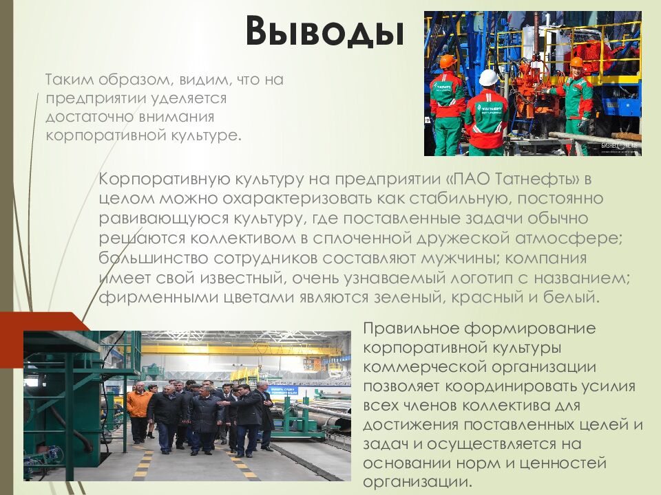 Правильное формирование корпоративной культуры коммерческой организации позволяет координировать усилия всех членов коллектива для достижения поставленных целей и задач и осуществляется на основании норм и ценностей организации. Таким образом, видим, что на предприятии уделяется достаточно внимания корпоративной культуре. Корпоративную культуру на предприятии «ПАО Татнефть» в целом можно охарактеризовать как стабильную, постоянно равивающуюся культуру, где поставленные задачи обычно решаются коллективом в сплоченной дружеской атмосфере; большинство сотрудников составляют мужчины; компания имеет свой известный, очень узнаваемый логотип с названием; фирменными цветами являются зеленый, красный и белый.