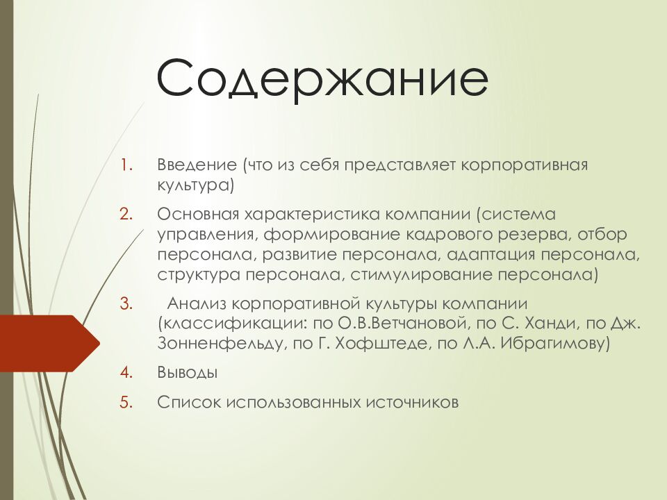 Введение (что из себя представляет корпоративная культура) Основная характеристика компании (система управления, формирование кадрового резерва, отбор персонала, развитие персонала, адаптация персонала, структура персонала, стимулирование персонала) Анализ корпоративной культуры компании (классификации: по О.В.Ветчановой, по С. Ханди, по Дж. Зонненфельду, по Г. Хофштеде, по Л.А. Ибрагимову) Выводы Список использованных источников