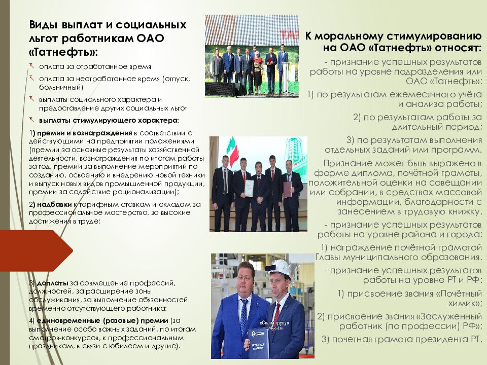 Виды выплат и социальных льгот работникам ОАО «Татнефть »: оплата за отработанное время оплата за неотработанное время (отпуск, больничный) выплаты социального характера и предоставление других социальных льгот выплаты стимулирующего характера : 1 ) премии и вознаграждения в соответствии с действующими на предприятии положениями (премии за основные результаты хозяйственной деятельности, вознаграждения по итогам работы за год, премии за выполнение мероприятий по созданию, освоению и внедрению новой техники и выпуск новых видов промышленной продукции, премии за содействие рационализации); 2 ) надбавки к тарифным ставкам и окладам за профессиональное мастерство, за высокие достижения в труде; 3 ) доплаты за совмещение профессий, должностей, за расширение зоны обслуживания, за выполнение обязанностей временно отсутствующего работника; 4) единовременные (разовые) премии (за выполнение особо важных заданий, по итогам смотров-конкурсов, к профессиональным праздникам, в связи с юбилеем и другие). К моральному стимулированию на ОАО «Татнефть» относят: - признание успешных результатов работы на уровне подразделения или ОАО «Татнефть»: 1) по результатам ежемесячного учёта и анализа работы; 2) по результатам работы за длительный период; 3) по результатам выполнения отдельных заданий или программ. Признание может быть выражено в форме диплома, почётной грамоты, положительной оценки на совещании или собрании, в средствах массовой информации, благодарности с занесением в трудовую книжку. - признание успешных результатов работы на уровне района и города: 1) награждение почётной грамотой Главы муниципального образования. - признание успешных результатов работы на уровне РТ и РФ: 1) присвоение звания «Почётный химик»; 2) присвоение звания «Заслуженный работник (по профессии) РФ»; 3) почетная грамота президента РТ.